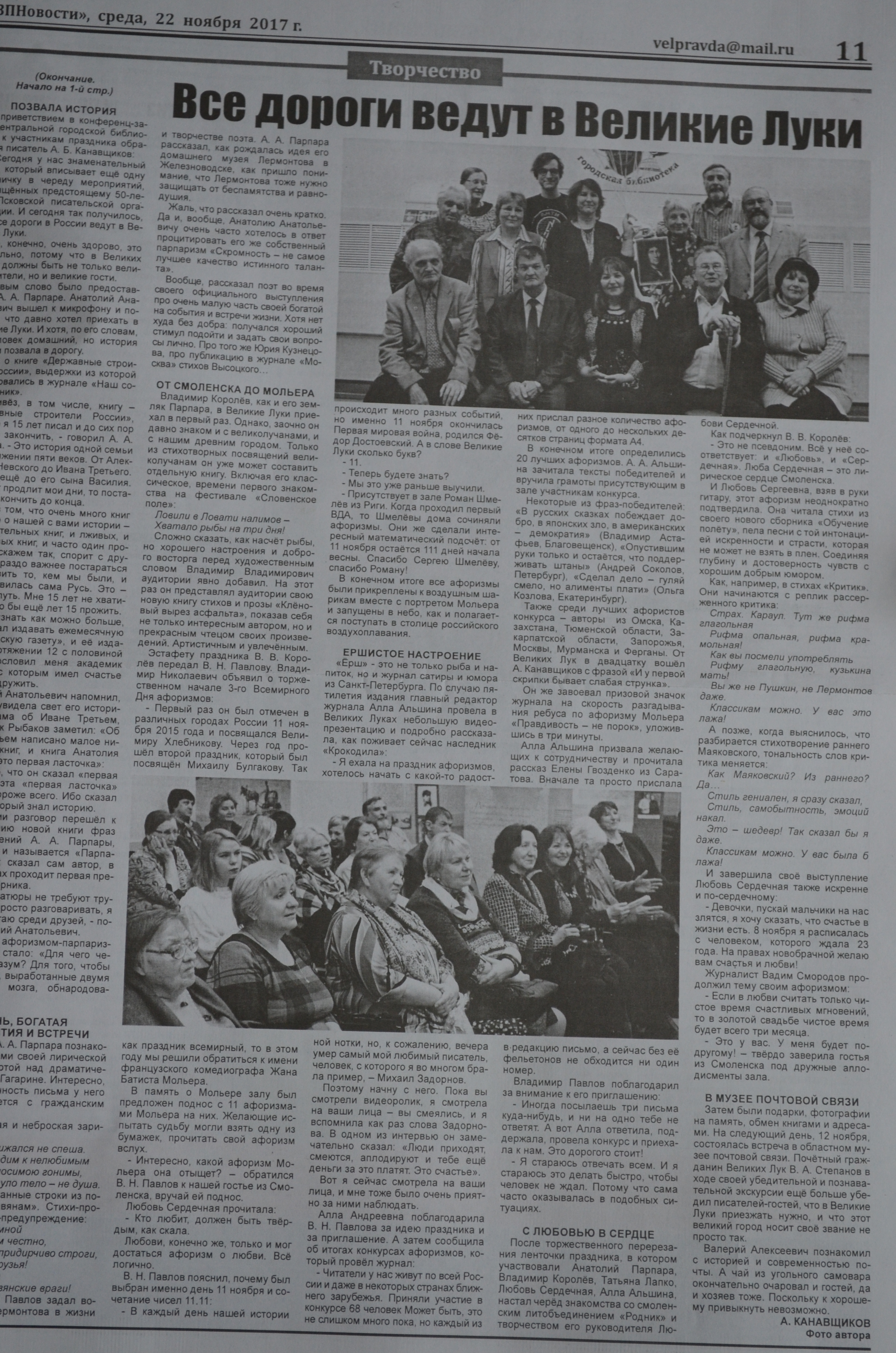 22.11.2017. Газета «Великолукская правда». Все дороги ведут в Великие Луки (о III ВДА).